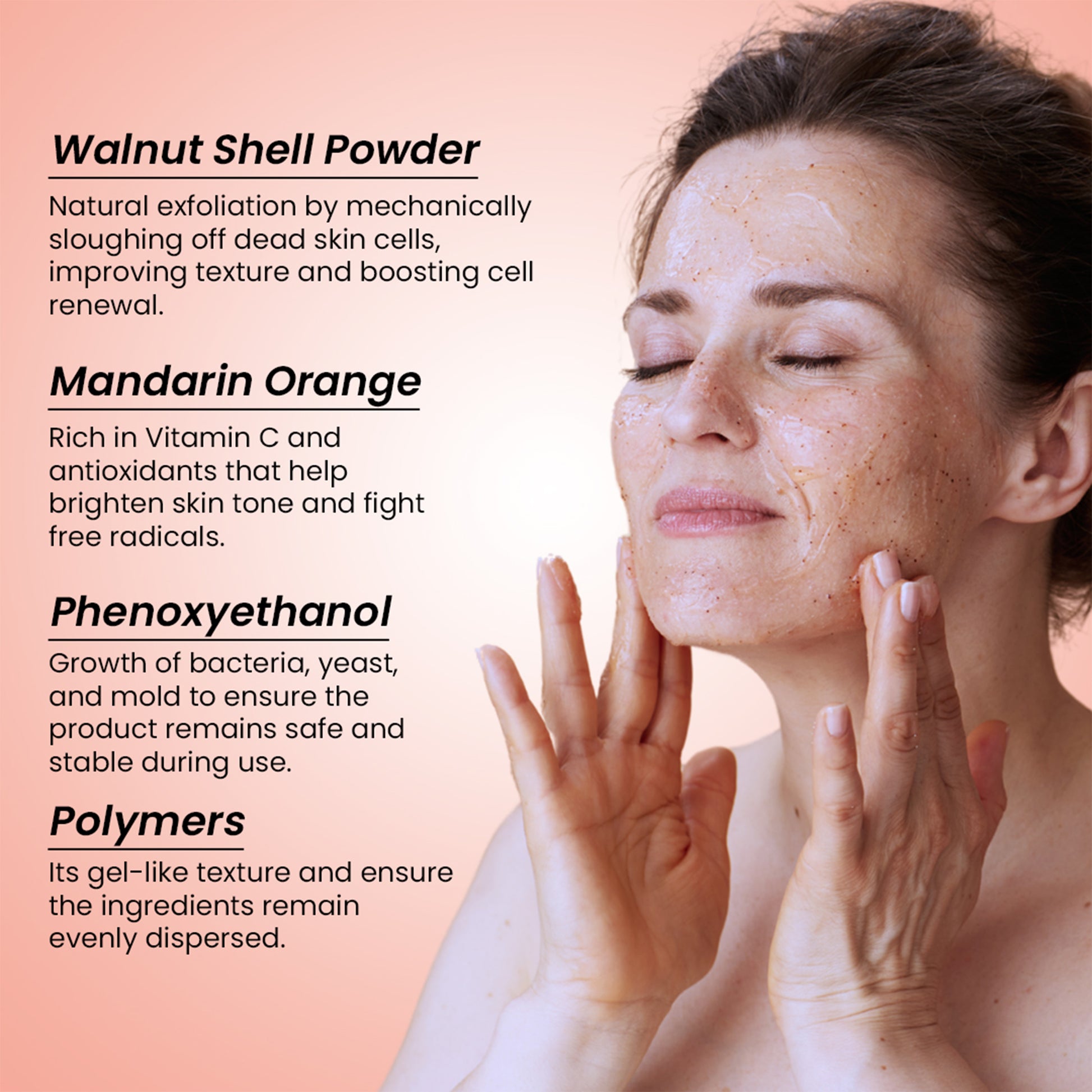 - Infused with Walnut Shell Powder & Mandarin Orange: This walnut scrub is powered by finely milled walnut shell powder to exfoliate dead skin cells and mandarin orange extract to refresh and brighten your skin. Designed to give a deep yet gentle cleanse that boosts glow without irritation.