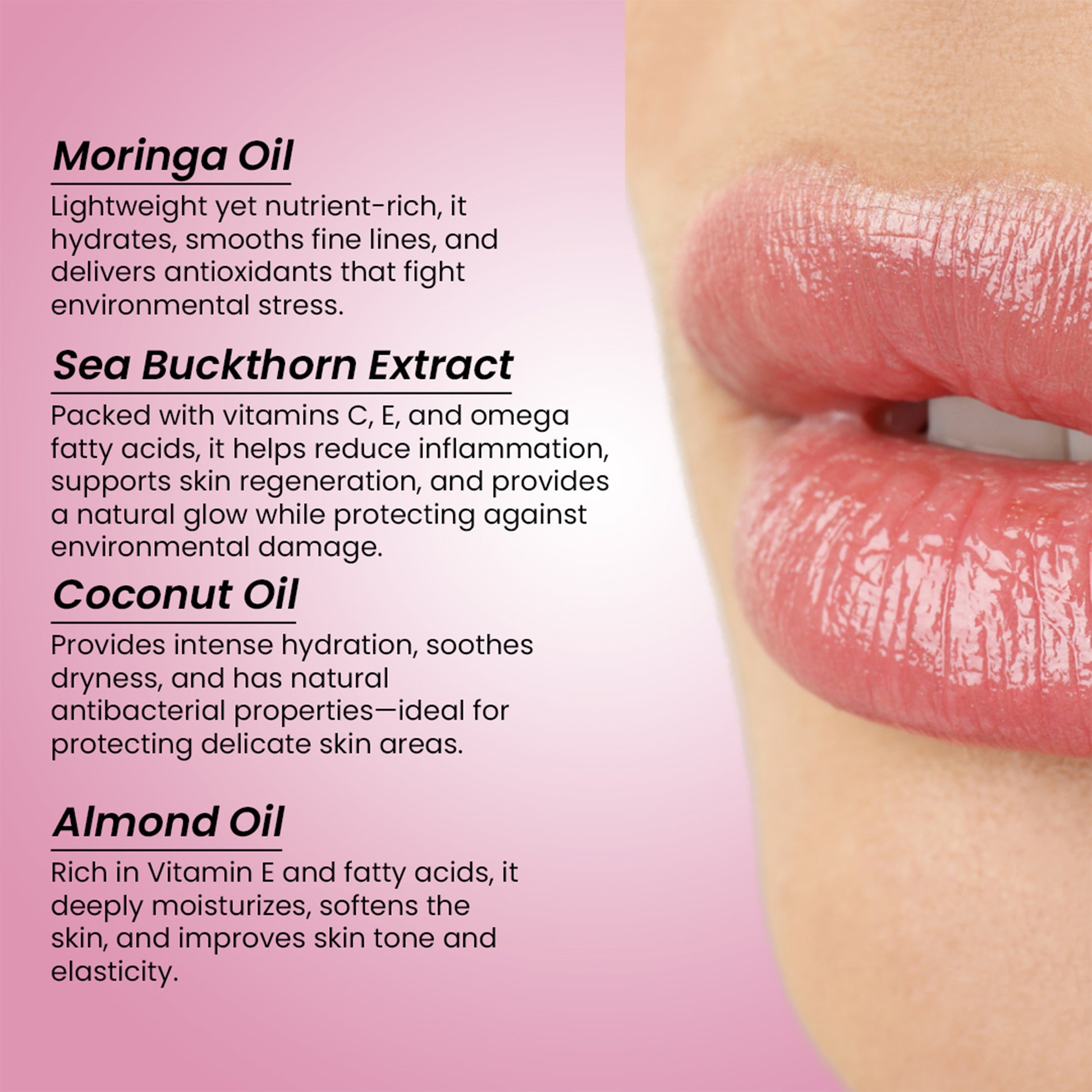 - Infused with Moringa, Sea Buckthorn & Nourishing Oils: This organic lip balm combines moringa oil, sea buckthorn extract, coconut oil, and almond oil to deliver deep hydration and nourishment. Perfect for softening dry lips while adding a beautiful ruby red glow.