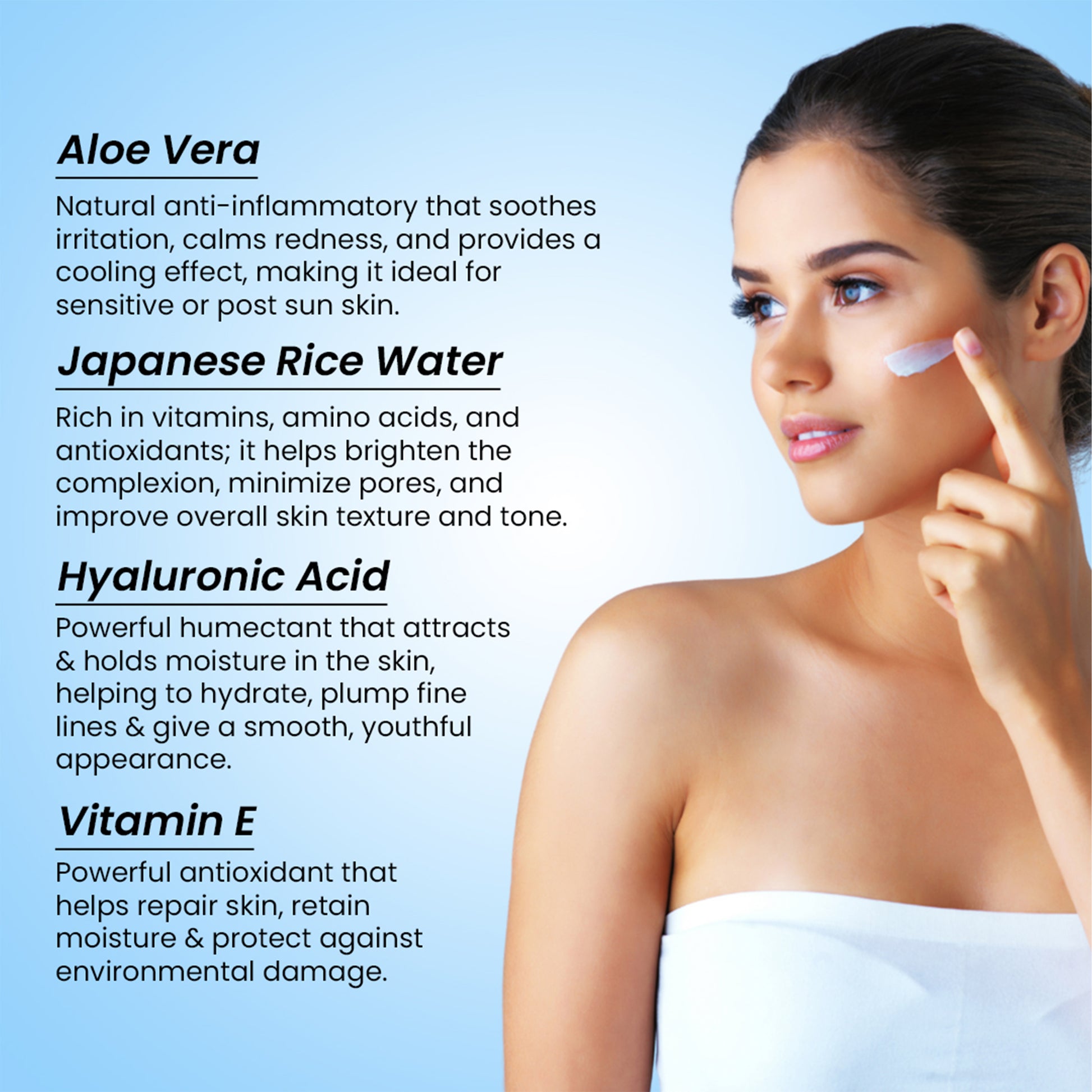 - Powered by Hyaluronic Acid, Aloe Vera & Japanese Rice Water: This hydrating moisturiser for face is enriched with hyaluronic acid for deep hydration, aloe vera for calming, and Japanese rice water to restore skin’s glow. The perfect gel based moisturizer for face, it delivers lightweight nourishment without greasiness.