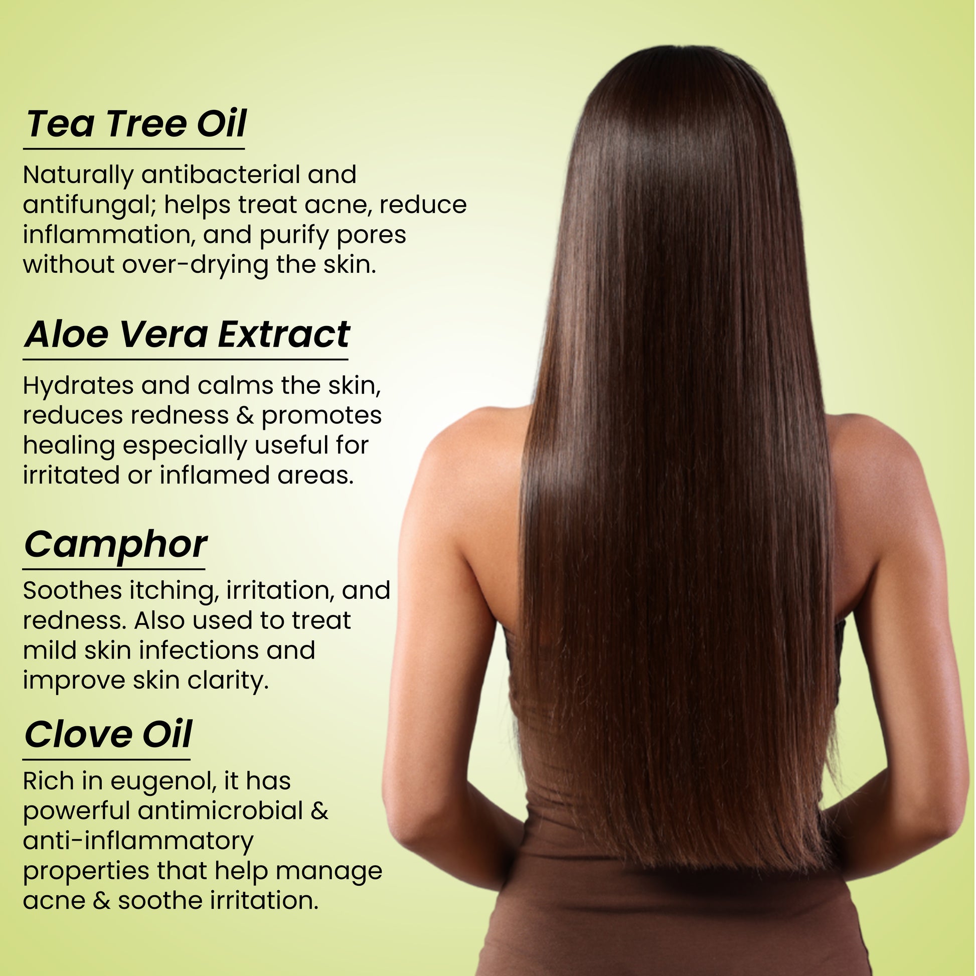 - Infused with Tea Tree Oil, Camphor & Aloe Vera Extract: This ayurvedic shampoo combines the cooling relief of camphor, the antibacterial power of clove oil, and the scalp-soothing benefits of aloe vera extract and tea tree oil. Together, they purify, calm, and nourish the scalp — making it an effective scalp plus shampoo anti dandruff solution.